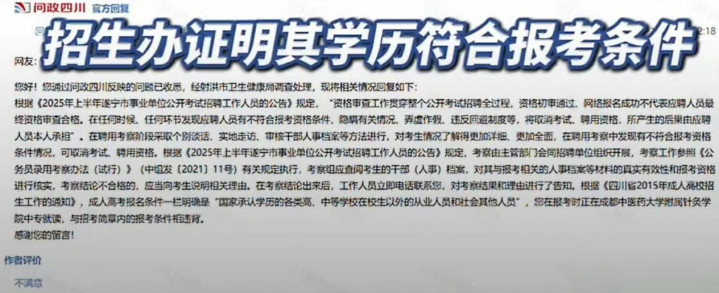 但税女士提供的一份盖章证明,却直接推翻了这一说法。2025年9月24日,射洪市教育考试院、射洪市教育招生考试委员会办公室联合出具材料,明确写着“该考生符合当年全国成人高校报考条件”。一边是招聘主管部门认定的“违规”,一边是教育招生部门盖章的“合规”,两个权威机构的矛盾表态,让事件真相陷入罗生门。