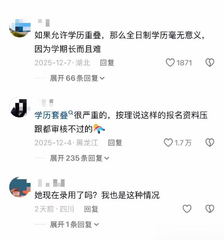 朱雪进一步解释,税女士的学历重叠问题存在历史政策差异,当年成人高考报名政策在地方实践中可能与省级文件有出入,但只要她不存在弄虚作假骗取学历的行为,相关责任就不应由考生承担。“考生基于教育部门的合规认定取得学历,多年后却因同一问题被招聘单位否决,这违背了信赖保护原则。”律师的观点戳中了舆论痛点,不少网友留言表示:“不能让考生为当年的政策模糊性买单”“政审是审查合规性,不是变相淘汰高分者”。